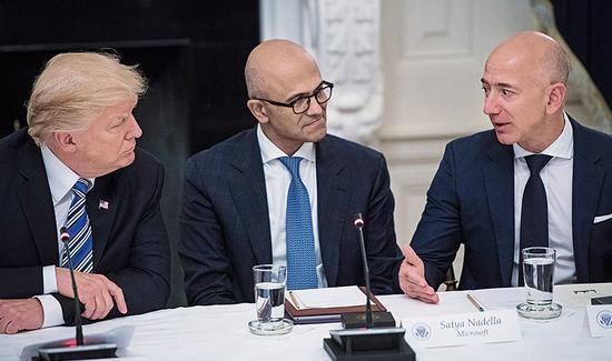 美国总统特朗普与纳德拉、亚马逊CEO贝佐斯谈论
