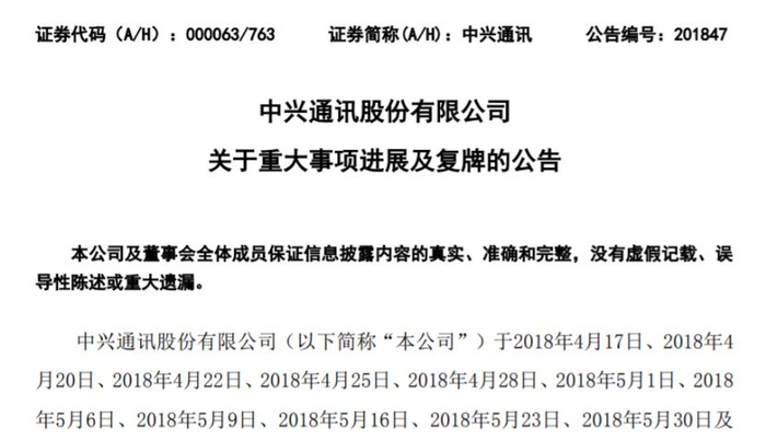 6月12日晚间,中兴通讯发布公告称,该公司A股将于2018年6月13日上午开市起复牌。