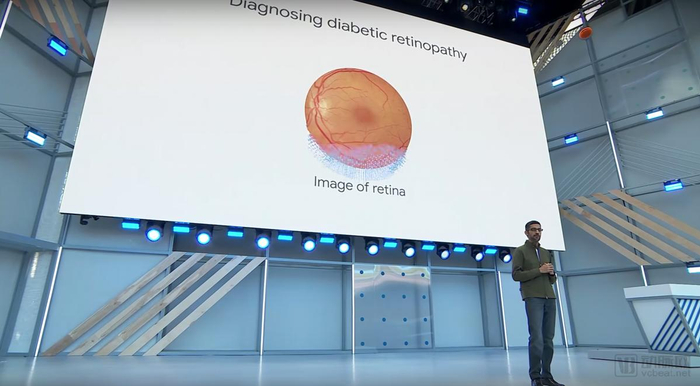 Sundar pichai在谷歌大会上介绍到:“去年,我们宣布了在糖尿病视网膜病变上的筛查的进展,糖网是致盲的主要原因,我们开发了AI技术帮助医生进行糖网的早期筛查,谷歌接下来在多地进行了临床实验,例如在印度的医院,临床实验结果显示非常好,AI技术可以用专家的诊断帮助医疗资源缺乏的地方。”