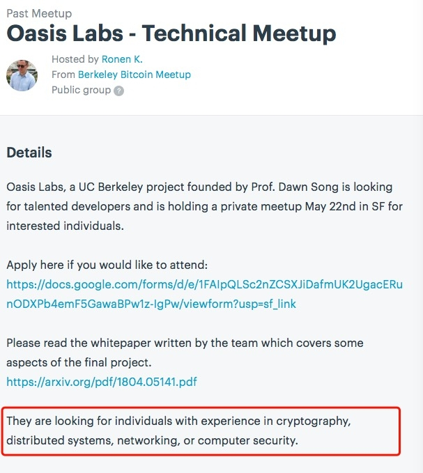 今年5月,Oasis曾举行过一场技术性的线下私密聚会,聚会的Co-organizer,Ronen同为宋晓东的Blockchain Lab成员。从报名者的反馈看,Oasis对此次活动进行了严格的筛选和保密措施,我们不妨猜测Oasis此举是在为其Ekiden项目施行「招兵买马」计划。不过,由于现有资料有限,Oasis Labs其他项目成员和规模信息暂未可知。