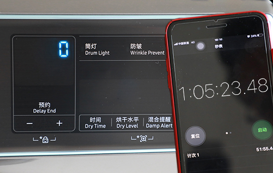 我们用手机计时器,为洗涤过程同步计时;经过51分钟55秒的等待,三星智慕·多维双驱洗衣机WW90M74GNOO完成了自己的工作,比预计时间要短一点。