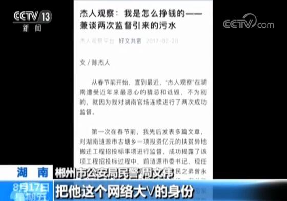 央视新闻客户端8月17日消息,近日湖南警方对外通报,因为涉嫌非法经营罪、敲诈勒索罪,网络大V陈杰人被湖南警方采取刑事强制措施。