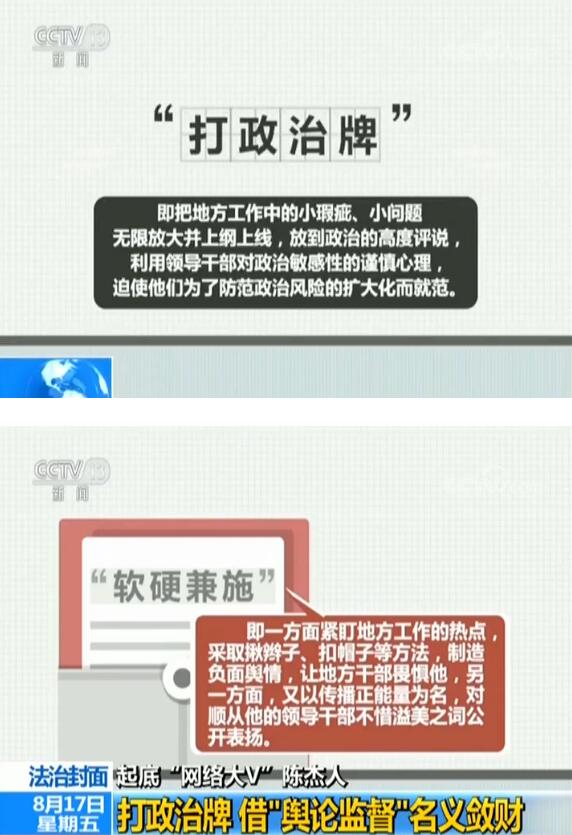 警方调查还发现,陈杰人犯罪团伙为牟取不法利益,以“舆论监督”为名,肆意攻击和污蔑党政干部,国家机关,司法部门和企业。