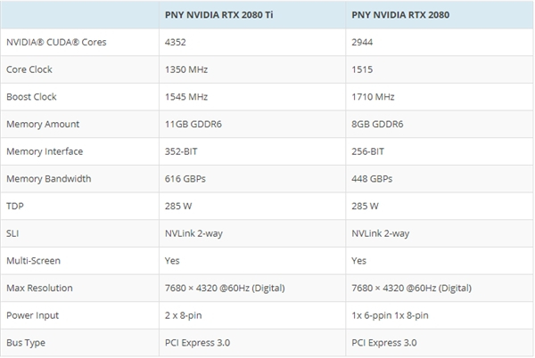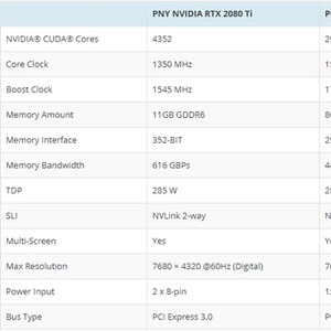 RTX 2080 Ti配备4352个流处理器(TU102),核心加速频率1545MHz,搭配352-bit 11GB GDDR6显存(带宽616Gbps),热设计功耗285W,999美元。