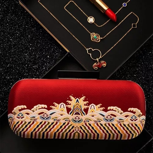 每一个套装内都包含了:长项链、芭莎红口红和一款叫作“海水江崖”的手包。