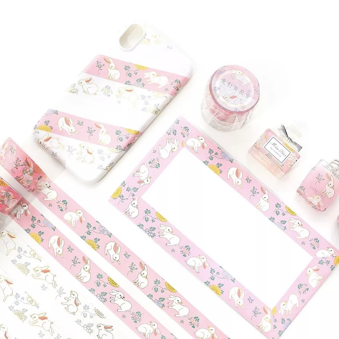 胶带的正面设计了手绘烫金风格的小白兔,分白色和粉色2款,每一只萌萌的兔子中间都点缀了小清新的菊花和牡丹。