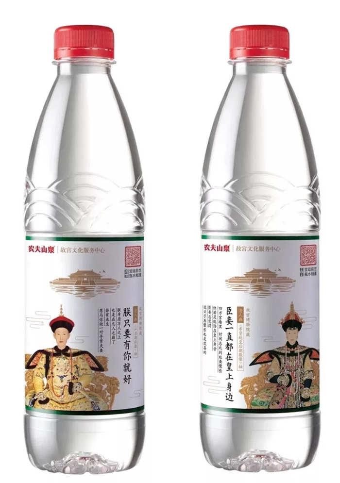 谁料到,趁着大家嗑的起劲,故宫顺势和农夫山泉合作了一波宫廷矿泉水,还出了“白月光”富察皇后和乾隆的 CP 款。