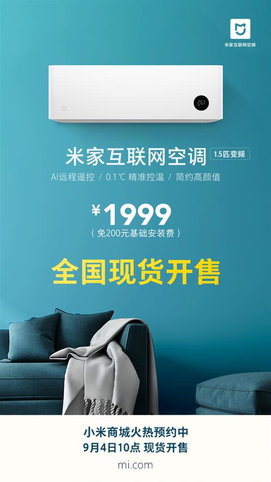 8月31日消息,米家空调官微表示,米家互联网空调今天上午10点在官网开启预约,9月4日上午10点现货开卖,售价1999元(免200元基础安装费)。