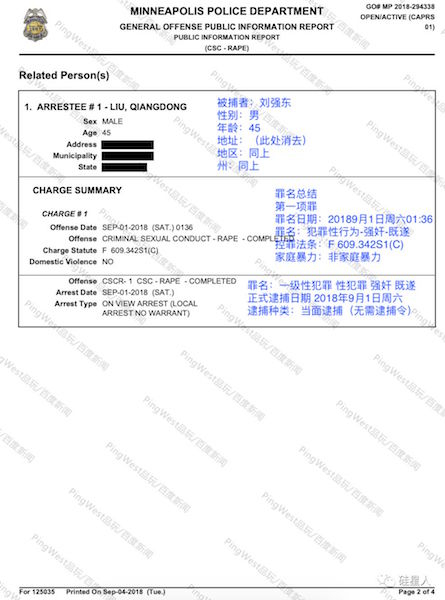 根据明尼阿波利斯警察向PingWest品玩记者/百度新闻特约记者展示的报告,刘强东疑犯一级强奸罪,于8月31日被警方逮捕。