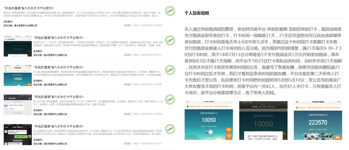现在在贴吧和聚投诉网都有大量关于早起打卡的投诉内容,《桂林晚报》提到,上海、北京、无锡、桂林等地警方都已经介入调查,可见这种模式的风险将逐渐被大众所认知。
