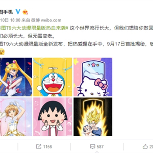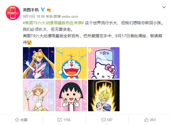 9月10日,美图手机官方微博发布消息,美图手机将联合美少女战士、Hello Kitty、哆啦A梦、七龙珠、樱桃小丸子和魔卡少女樱六大顶级动漫IP推出美图T9限量版手机,9月17日首批揭秘。