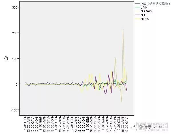 此外,NTRA股价波动也颇为剧烈,并频繁出现逆势上涨和逆势下跌的情况;NH的情况与NTRA类似;LIVN股价波动较为平缓,然而,稍大波动出现时,与大盘呈现相反走势。