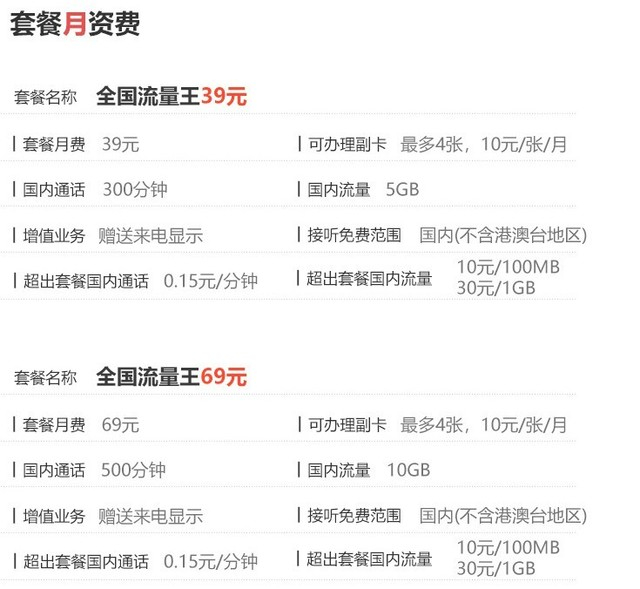 全国流量王,适用地区北京,月费39元,包含国内通话300分钟,流量5GB。