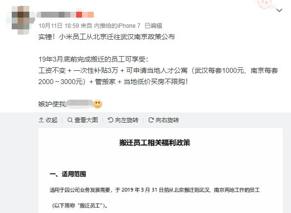 10月12日,一份小米集团《搬迁员工相关福利政策》在网络上流传。文件显示,在2019年3月底前从北京迁往武汉、南京的员工,将获得不小的奖励,包括基本工资不变、3万元搬迁福利费、不受当地限购政策影响可立即购房等等。