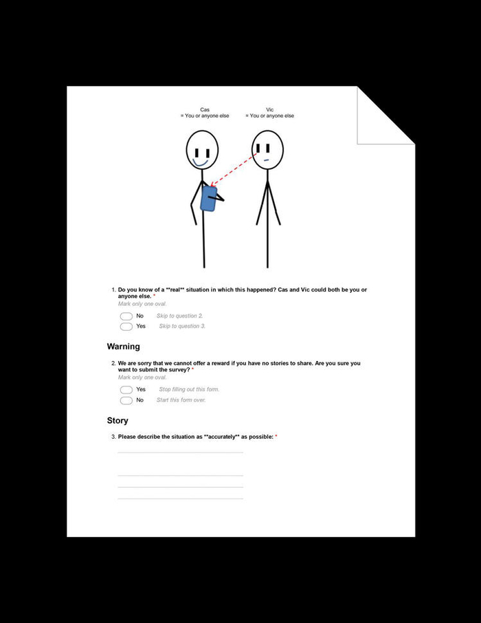 慕尼黑的研究人员写道,在这个世界,我们几乎无法忽视其他人的手机屏幕,“缺乏关于‘肩窥’事件及其对现实世界影响的详细调查”。于是他们发布了一份调查问卷,围绕一个假设情境提出了一系列问题:一位名为“维克”(Vic)的虚构角色正在看另一个名为“卡斯”(Cas)的虚构人物的移动设备,而卡斯却还“浑然不觉”。