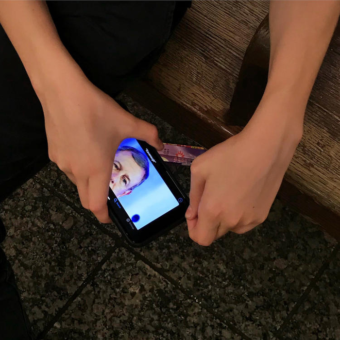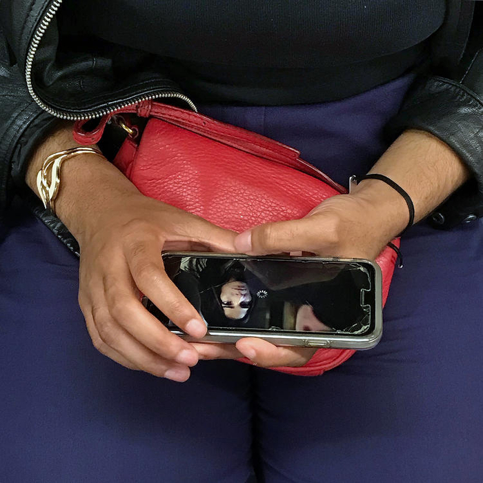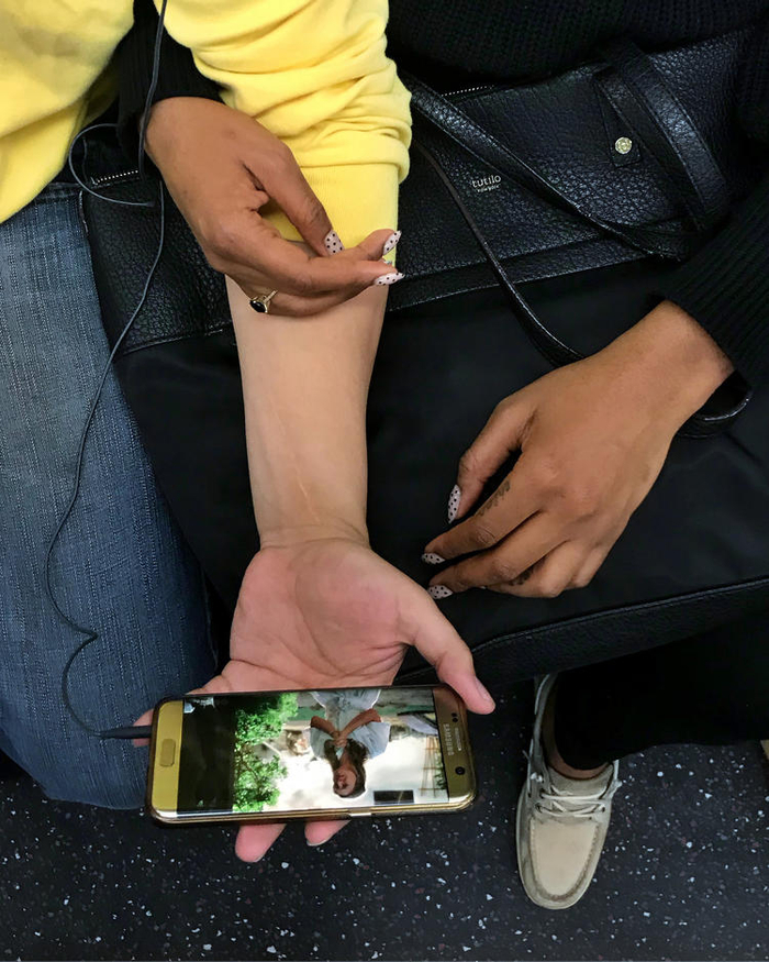 他人的手机屏幕是正在进行的工作:或是一些没有语境、紧张而简短的短信,输入再重新打字;然后,对于乘坐地铁的人而言,在下一站发送出去;又或是一些极长的信息,这种交流的长度甚至超出我对于手机交流的认知范畴。瞥见“离婚”的字眼后,窥视的人会立即羞愧地避过脸去。我们还会窥见精心修饰之后又舍弃的自拍;或充满宗教主张、看似没完没了的群信息链;或是大量讨论客户的工作邮件,因为火车和办公室、家一样,已经成了工作场所。