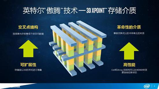 3D XPoint虽然和NAND闪存一样都是非易失性存储技术,但原理、特性截然不同。它并非基于晶体管设计,而是采用交叉点3D结构,由此带来了全方面的革命性突破,包括耐久性和寿命更长(可以每天全盘写入十几次)、存储密度更高、性能更高(单元和阵列结构状态切换更快)、延迟更低(基于bit比特而非block区块)、扩展性更佳(存储层3D堆叠)。