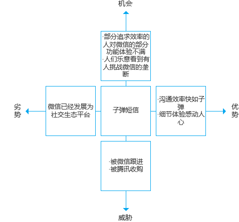 根据黄金圈理论,我们先分析一下子弹短信的优势、劣势、机会和威胁分别是什么(WHAT)。