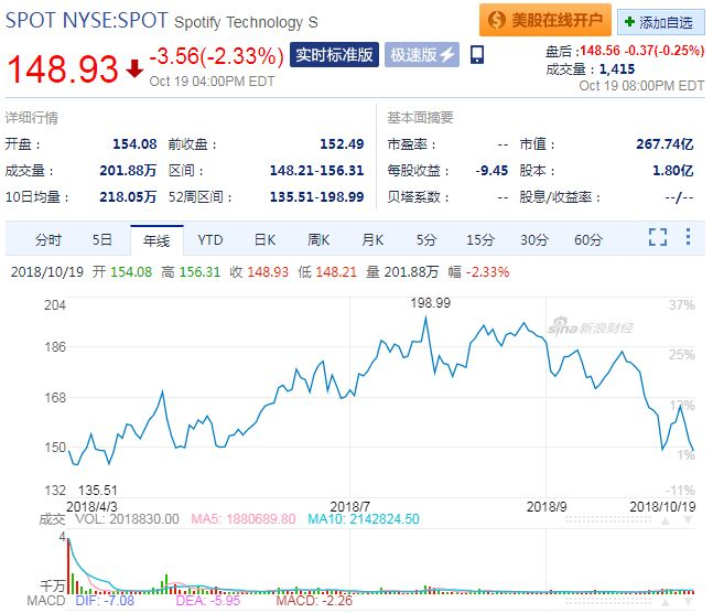 2018年4月4日,Spotify直接挂牌上市交易(Direct listing),代码SPOT。上市首日以149.01美元每股的价格收盘,比开盘价下跌10%,市值265亿美元,之后股价由132美元一路上涨探高近199美元,涨幅近50%。