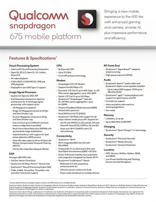 与此同时,骁龙675还集成了Spectra 250L ISP,最高支持2500万像素单镜头、1600万像素双摄。同时,支持480fps@720p慢动作视频拍摄,支持4800万像素照片输出,支持5倍光学变焦、2.5倍广角以及超广角。