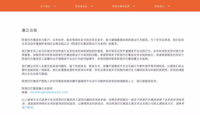 2012年,阿里成立“廉正合规部”,用以调查腐败、预防及合规管理。与各业务线以及内审、内控部门都保持充分的独立,廉正调查“上不封顶”,问责权限一视同仁,并且公布了反腐邮箱。