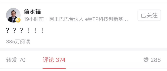 对于本身就受到各种政策束缚的综艺节目来说,一丁点的风吹草动,都会动摇各方的信心。杨伟东的前领导,阿里eWTP投资工作小组组长俞永福在今日头条敲下几个标点:???!!!