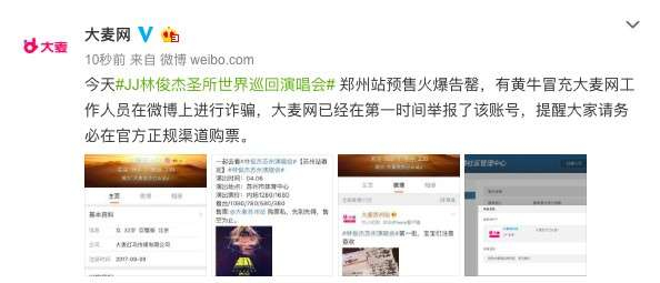 继前几天林俊杰《圣所2.0》巡演杭州、苏州两站预售双双告捷后,今天林俊杰巡演大麦网郑州站预售再度速罄。看到如此火爆的抢票场面,少数票贩黄牛更是冒充大麦网工作人员在社交平台诈骗。对此,大麦网官微第一时间予以举报,联动公安部门继续净化票务市场空气。