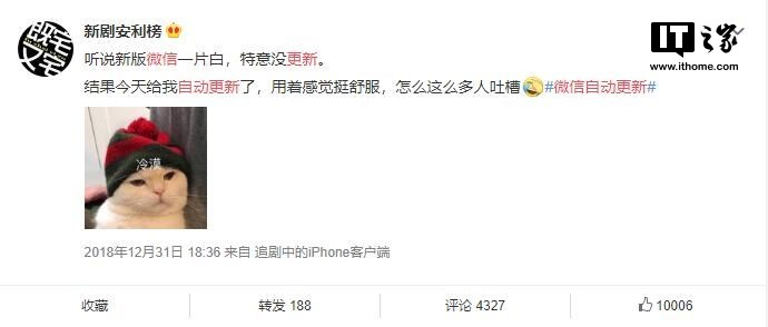 其实微信界面变好看或者变难看这一点不同人自有不同看法,而如果微信为了强推新版在没有经过用户的情况下,自动为用户升级至新版这个做法显然是不妥的,用户应该有权利决定自己要不要对版本进行升级。