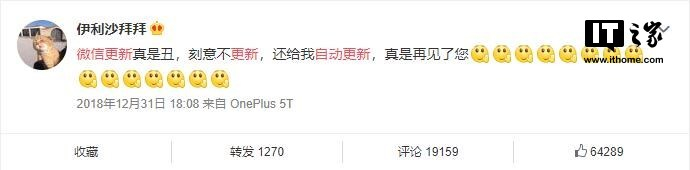 今日,微信就因为自动更新登上了微博热搜榜。网友“伊利沙拜拜”表示,微信v7.0版本更新之后界面变丑,自己刻意不更新这一版本,结果微信给自动更新了。对于这位网友的微博,截至发稿时间,已经有近65000网友点赞。