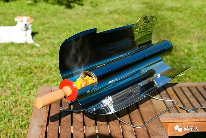 GoSun 烤炉采用管式设计,在使用时只需要把处理好的肉和菜塞进管子里,再展开两个反光板集中太阳能(原理类似于小时候用放大镜烧蚂蚁)就可以了。