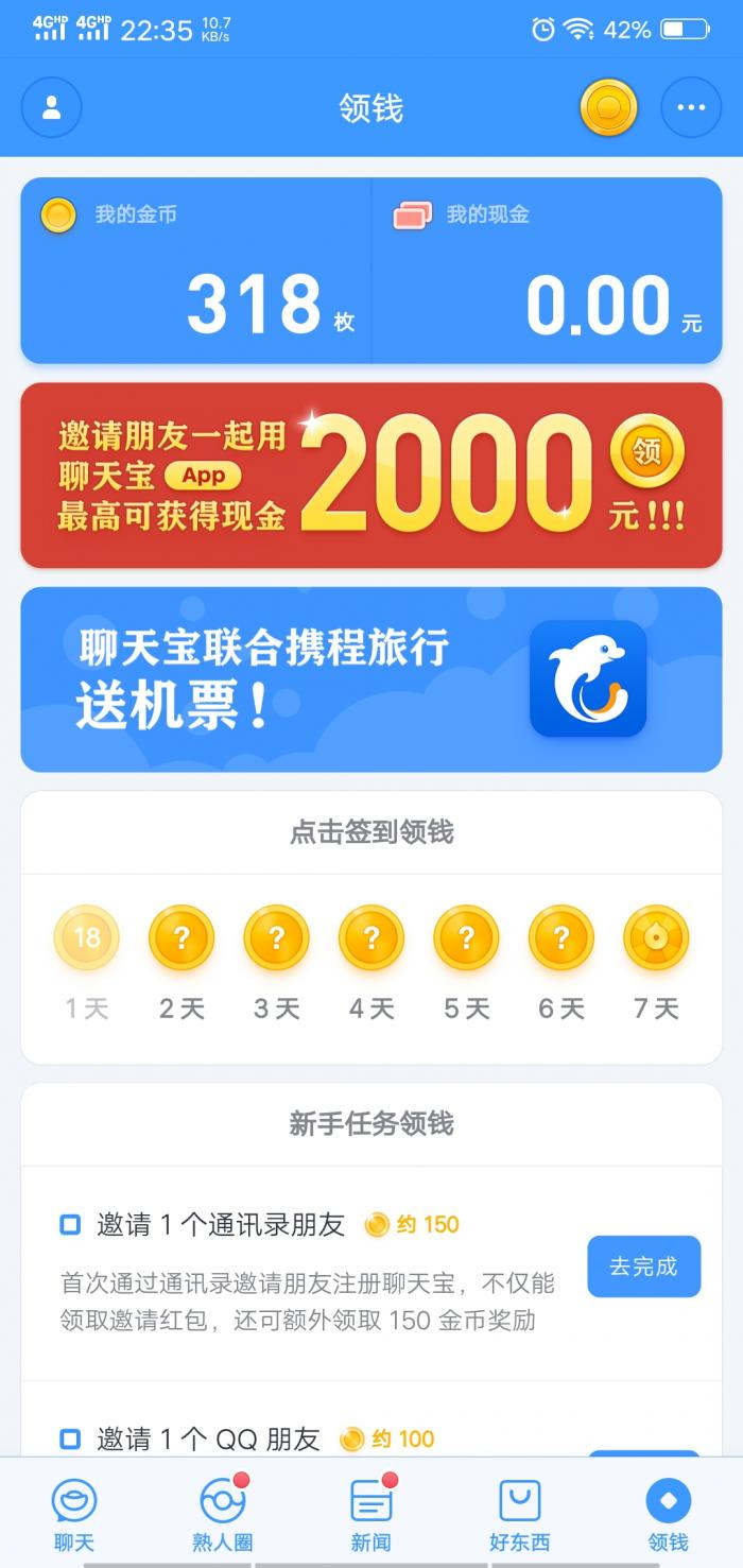 在经历了一轮升级后,聊天宝相比于此前的子弹短信,在内容和细节上都做了增量。从界面上看,除了聊天之外,聊天宝还有新闻、电商、领钱板块。一个原来高大上的子弹短信,变成了比较不那么曲高和寡,向三四五六线城市渗透的聊天宝。