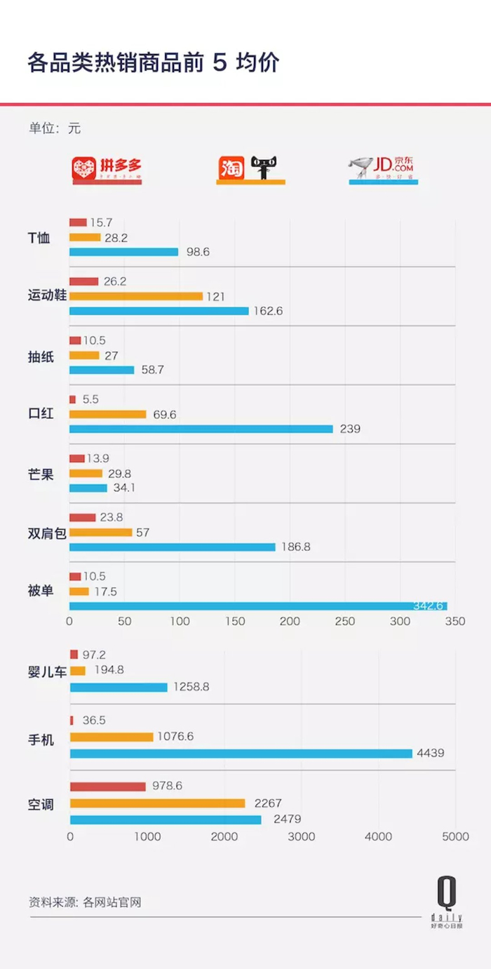 统计结果显示,拼多多上的手机、双肩包、运动鞋等 7 个品类的 Top 5 热销商品均价都有上涨。但像 T 恤、空调、口红这 3 个品类商品的均价有下降。