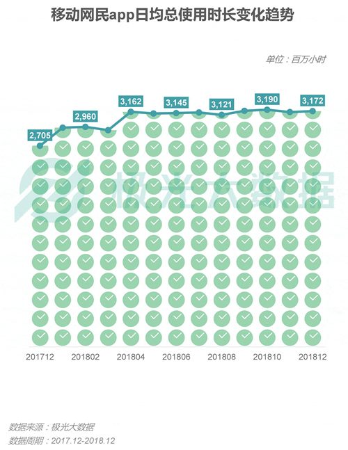 极光大数据的统计结果显示,截至2018年12月,移动网民的app日均总使用时长达31.72亿小时,较17年同期增长17.3%。
