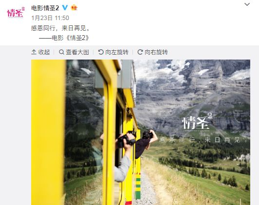 距离宣布提档上映还不足48小时,电影《情圣2》官方微博却在1月23日又亮出了一张“感恩同行,来日再见”的海报,确认影片正式撤档的消息。