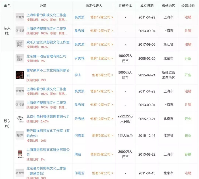 天眼查信息显示,吴秀波与12家公司有股权关联,涵盖影视、餐饮、酒店等多个行业。