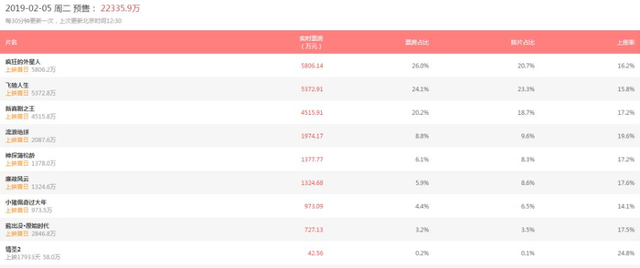 根据猫眼专业版上的数据显示,现在《情圣2》的预售票房在贺岁档电影中排名最末,实时票房仅42万,票房占比和排片占比远不及其他春节档电影。
