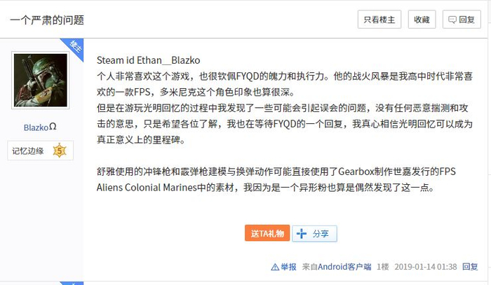 事实上早有游戏发售的第三天,就有玩家公开自己的Steam ID,“实名”在光明记忆贴吧郑重地发了一则帖子,标题为“一则严肃的问题”。