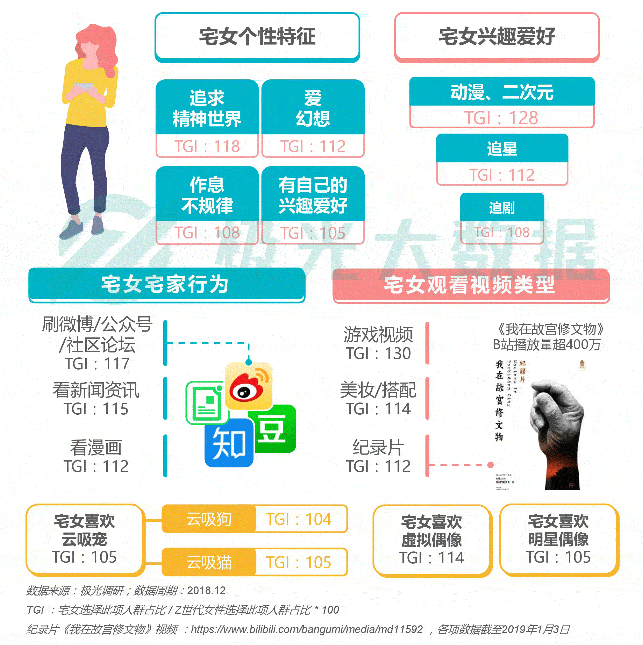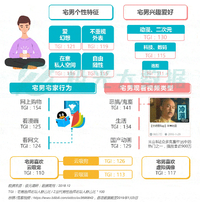 根据极光大数据的调研结果,相比一般男生,宅男更爱购物、看漫画、看网文,偏好天马行空的鬼畜视频、亦真亦幻的虚拟偶像,也爱云吸猫云吸狗。