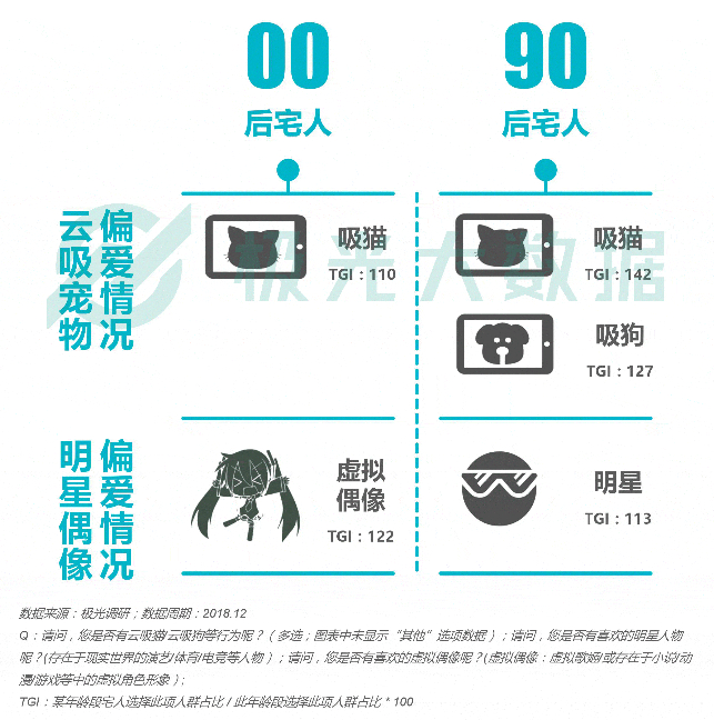 根据极光大数据的调研结果,相比同龄人,追求治愈的90后宅人超爱上网吸猫吸狗。明星更受到90后宅人的喜爱,而虚拟偶像作为新兴形式逐渐在95后宅人和00后宅人中风靡。