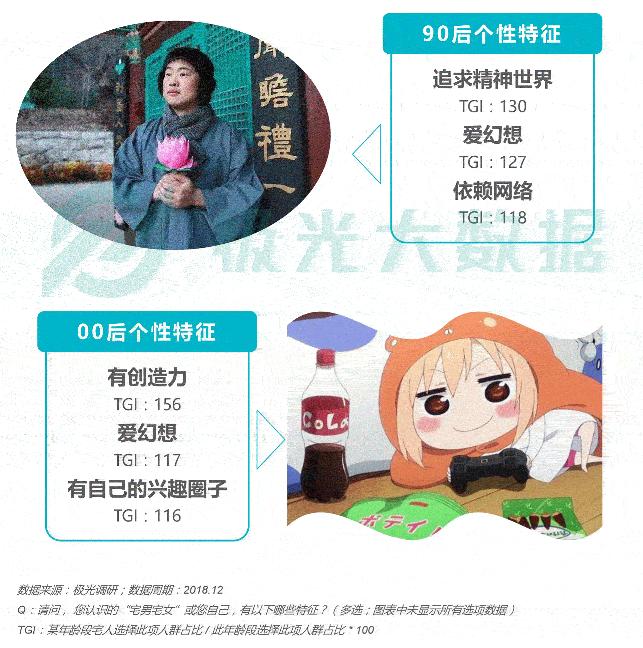根据极光大数据的调研结果,90后宅人比同龄人更追求精神世界,也更依赖网络;而00后宅人则比同龄人更有创造力,在各种兴趣圈中乐此不疲。