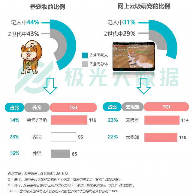 根据极光大数据的调研结果,宅人喜欢宠物的陪伴和“云吸宠” 带来的治愈感。
