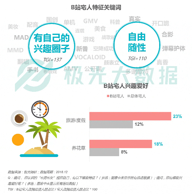根据极光大数据的调研结果,B站宅人有更强烈的兴趣意识,个性自由随性,生活方式积极乐活。他们喜欢养花养草、旅游度假,更乐于通过多种方式享受生活。