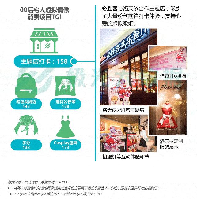 根据极光大数据的调研结果,00后宅人对虚拟偶像的爱深入其消费行为,他们在“主题店打卡”、“箱包类”等方面的消费都远超同龄人。