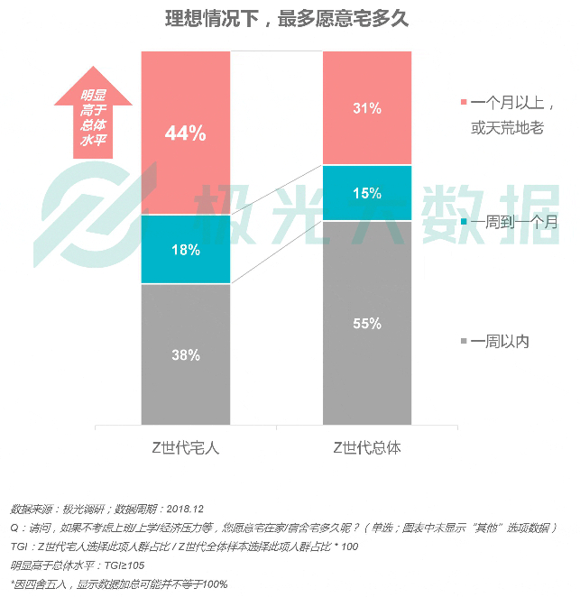 根据极光大数据的调研结果,理想情况下,超过4成宅人愿意宅在家中超过一个月。
