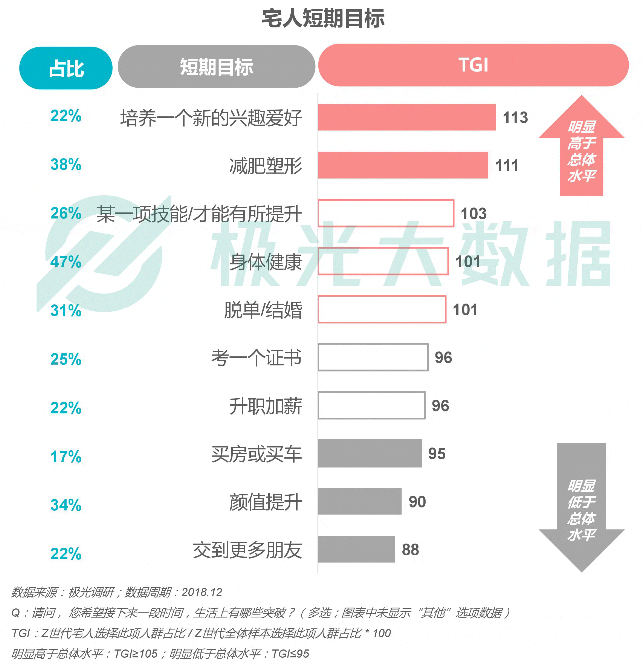 根据极光大数据的调研结果,宅人更偏向将培养兴趣作为自己的小目标,改善宅家带来的身体走形也是一大需求。