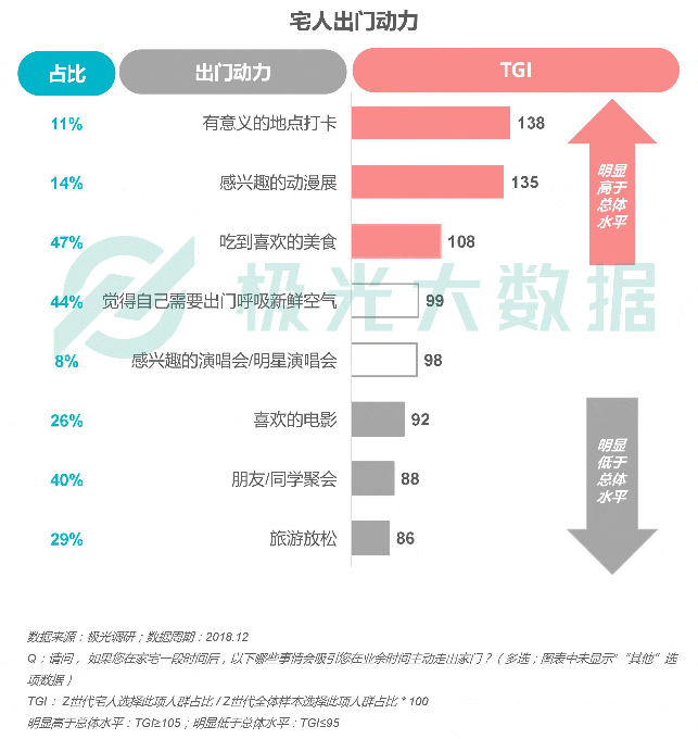 宅人即使出门,也是因为兴趣的驱动。根据极光大数据的调研结果,“圣地打卡”、“动漫展”最具吸引力,而单纯的同学聚会、旅游放松较难吸引他们迈出家门。