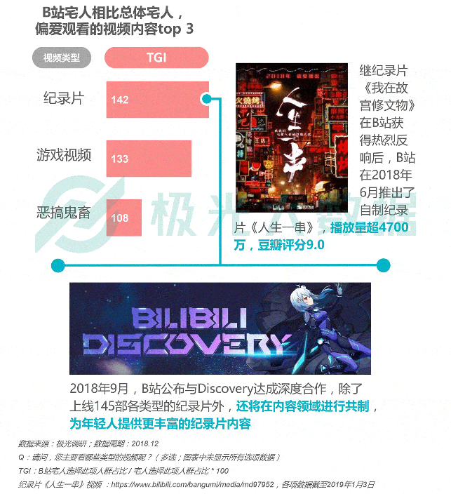 根据极光大数据的调研结果,B站宅人不仅热爱脑洞,也追求内涵,喜爱观看纪录片来满足对世界的好奇心。