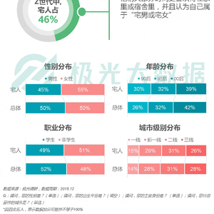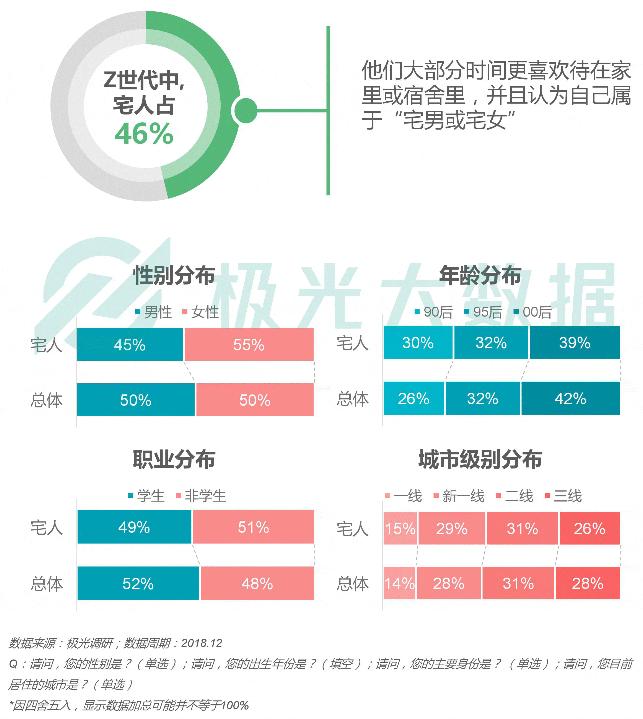 根据极光大数据的调研结果,几乎每两个Z世代中就有一个宅人。在宅人群体中,女性、90后、上班族的比例更高。