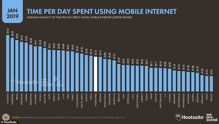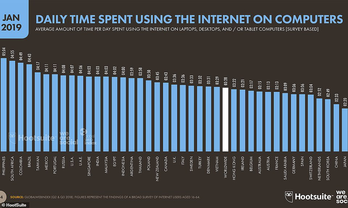 日本人在网上花费的时间最少,平均为3小时45分钟,其次是中国。每日在计算机上使用互联网的时间方面,南非、哥伦比亚、巴西紧随菲律宾之后。