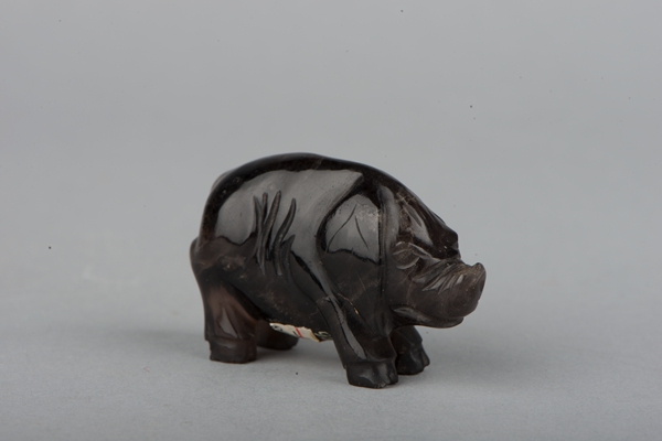 长9.5厘米,宽5.2厘米,高6.3厘米,猪的额头上雕刻出了长长的鬃毛,以及捆绑在身体上的缚绳,背上披着带有如意纹的盖毯,虽然看起来圆润可爱、憨态可掬,表现的却应是一只野猪的形象。类似的玉雕小件为清代的文玩用品,形象或兽或禽,一般置于案头、书架,可远观,也可上手把玩。